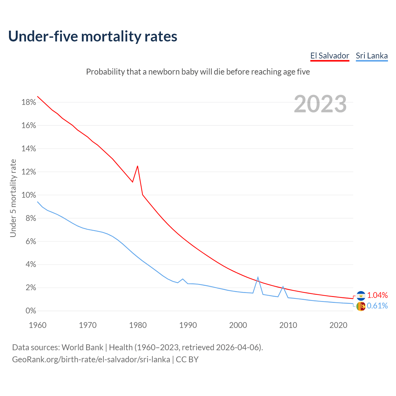 The chance that a newborn baby will die before reaching age five is 1.04% in El Salvador and 0.61% in Sri Lanka. Above is a chart with historical data on under-five mortality rates.