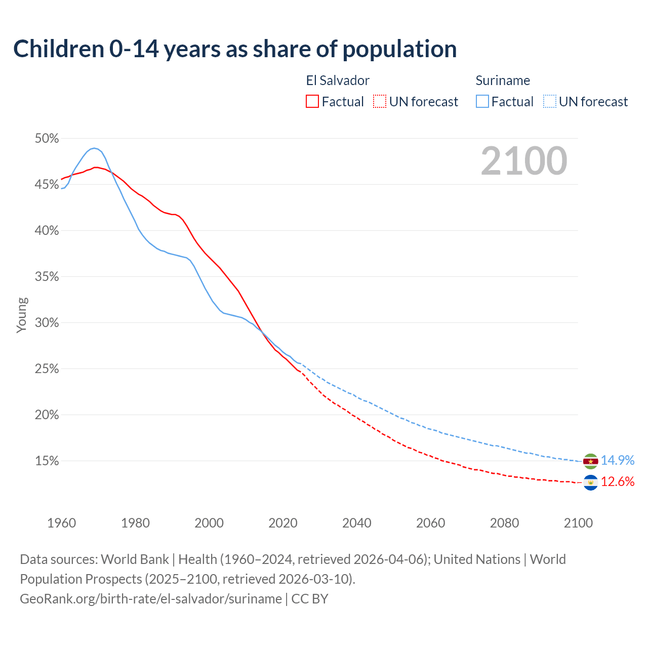 According to the latest available data on birth rates, the fertility rate in El Salvador was 1.78 children per woman in 2023, compared to 2.25 in Suriname in 2023. The replacement level is considered to be 2.1 children per woman.