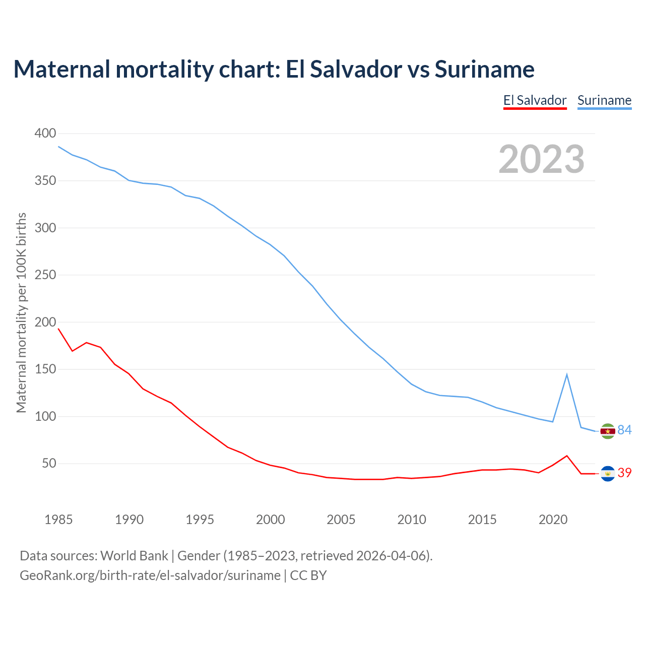 The maternal mortality rate, which is the probability of dying during childbirth or within 42 days of pregnancy termination, is 39 deaths per 100,000 live births in El Salvador, compared to 84 deaths in Suriname.
