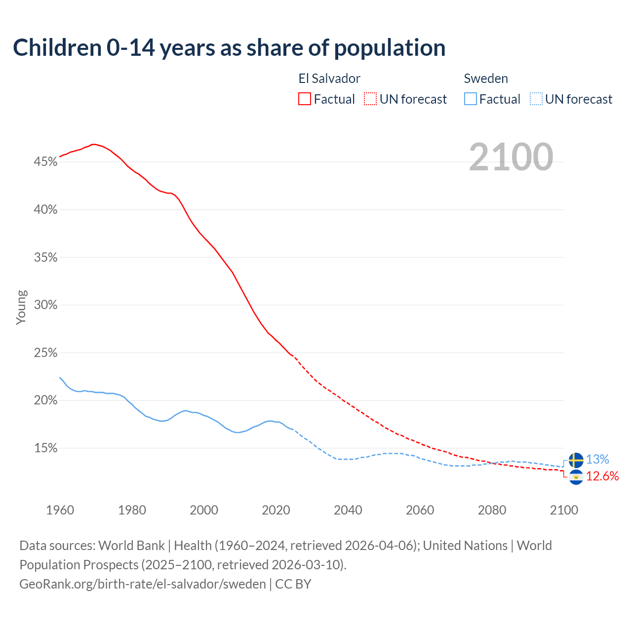 According to the latest available data on birth rates, the fertility rate in El Salvador was 1.78 children per woman in 2023, compared to 1.45 in Sweden in 2023. The replacement level is considered to be 2.1 children per woman.