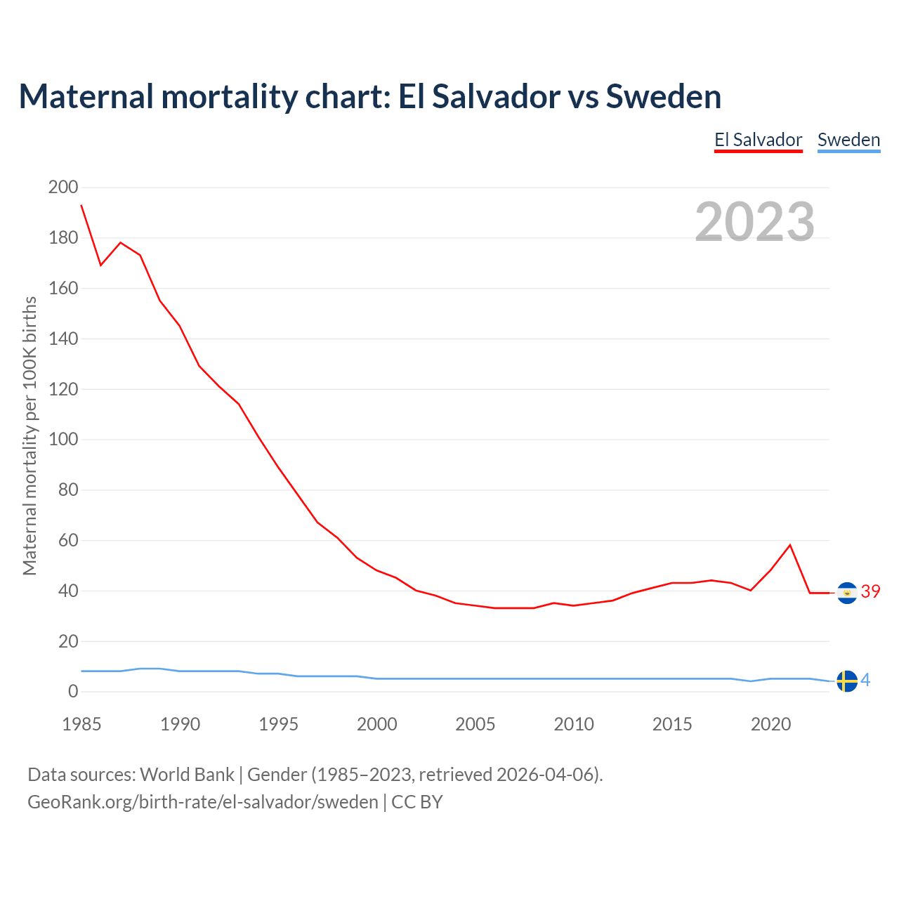 The maternal mortality rate, which is the probability of dying during childbirth or within 42 days of pregnancy termination, is 39 deaths per 100,000 live births in El Salvador, compared to 4 deaths in Sweden.