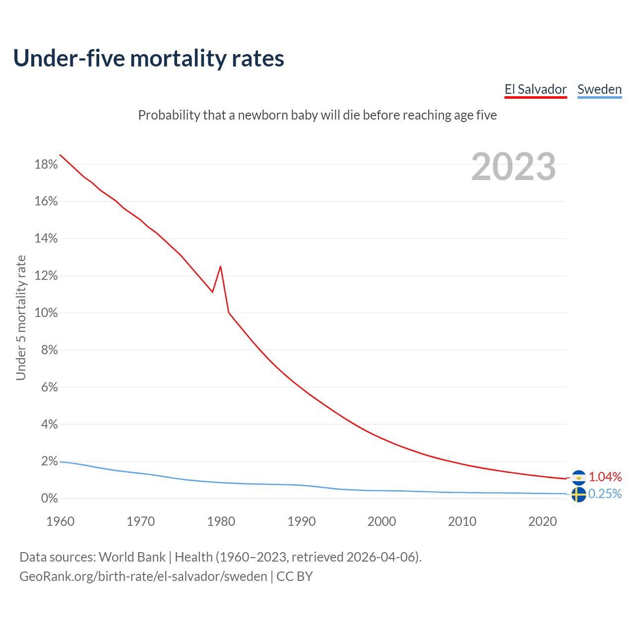The chance that a newborn baby will die before reaching age five is 1.04% in El Salvador and 0.25% in Sweden. Above is a chart with historical data on under-five mortality rates.