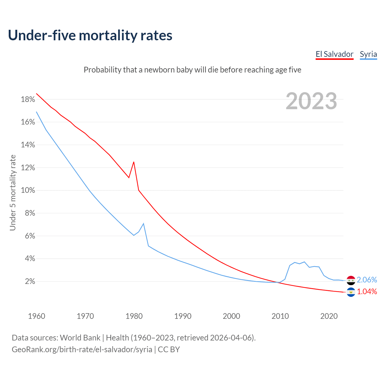 The chance that a newborn baby will die before reaching age five is 1.04% in El Salvador and 2.06% in Syria. Above is a chart with historical data on under-five mortality rates.
