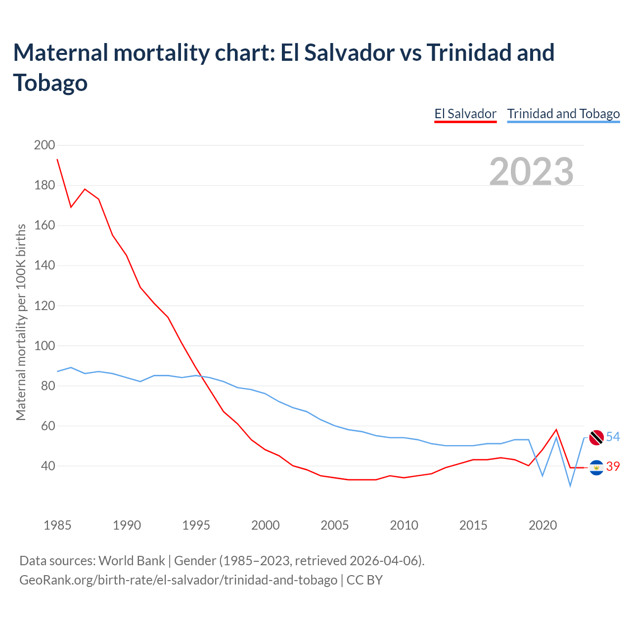 The maternal mortality rate, which is the probability of dying during childbirth or within 42 days of pregnancy termination, is 39 deaths per 100,000 live births in El Salvador, compared to 54 deaths in Trinidad and Tobago.