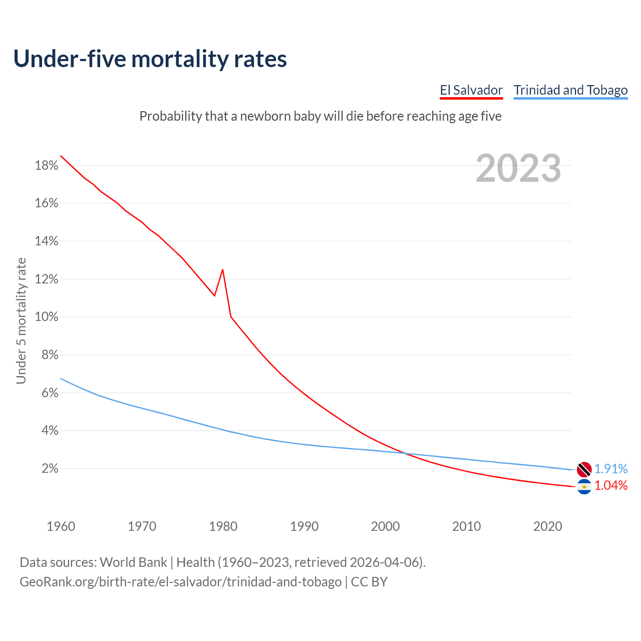 The chance that a newborn baby will die before reaching age five is 1.04% in El Salvador and 1.91% in Trinidad and Tobago. Above is a chart with historical data on under-five mortality rates.