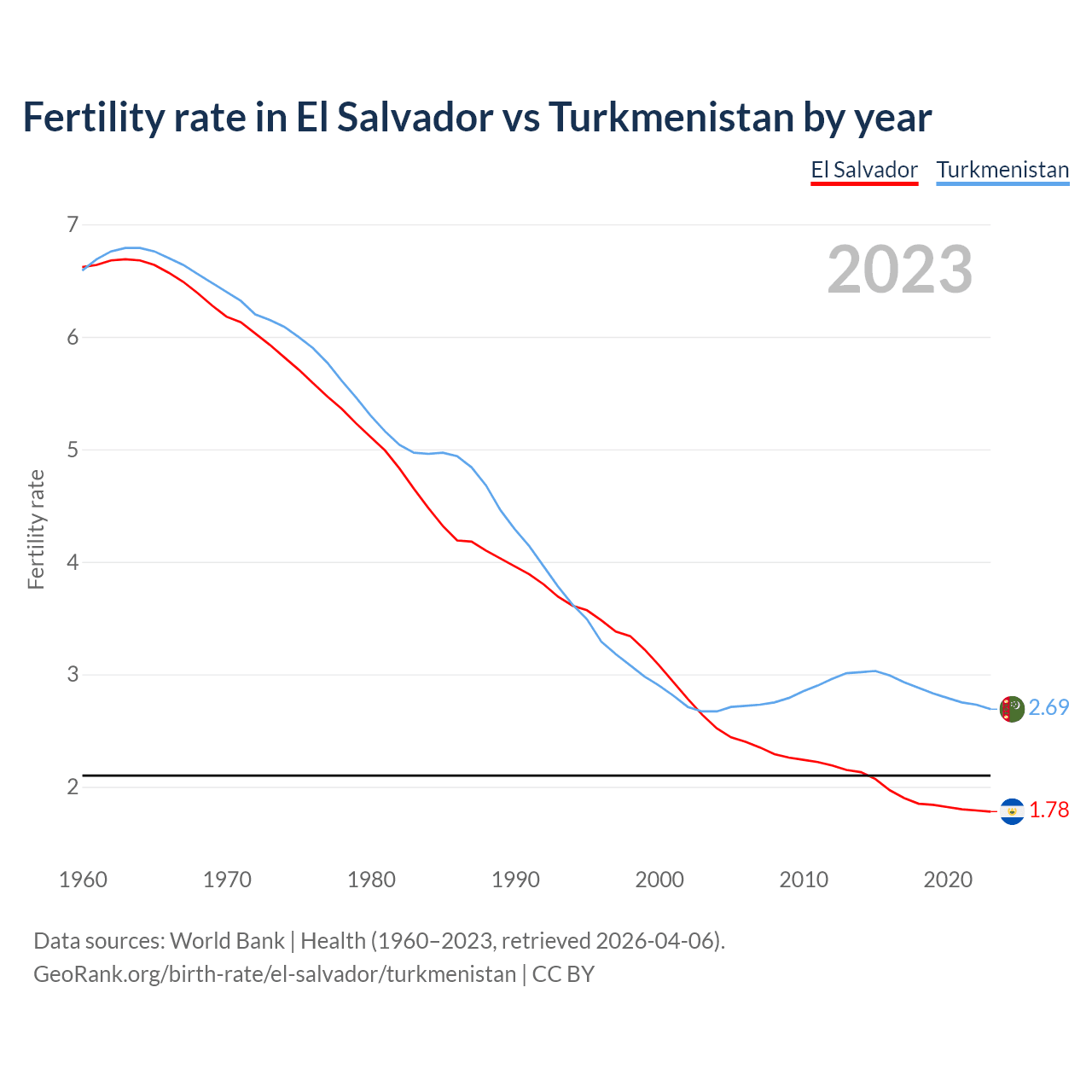 1960 vs 2023, the fertility rate has decreased by 73.2% in El Salvador and by 59.2% in Turkmenistan — in 1960, it was 6.62 and 6.59, respectively.