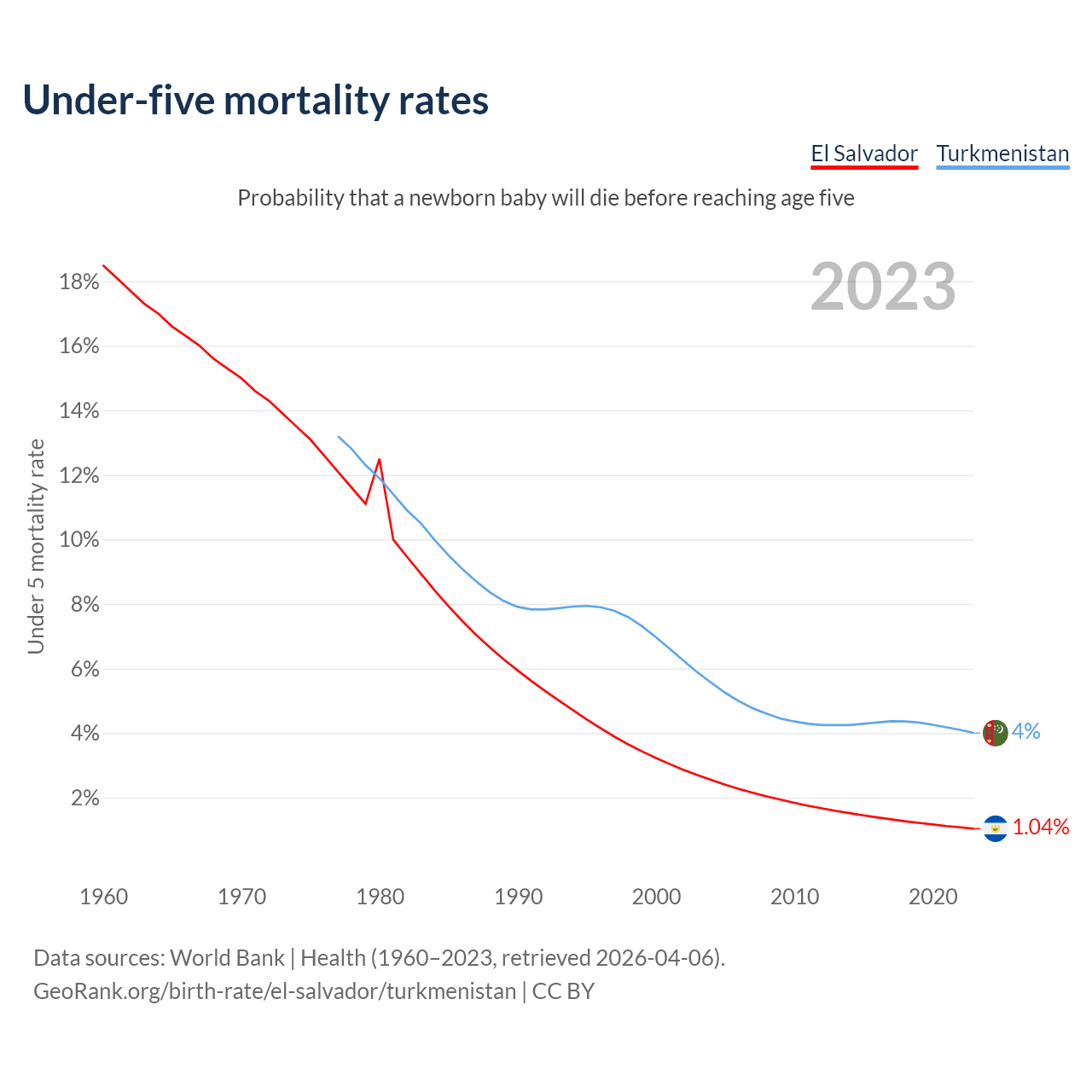 The chance that a newborn baby will die before reaching age five is 1.04% in El Salvador and 4% in Turkmenistan. Above is a chart with historical data on under-five mortality rates.