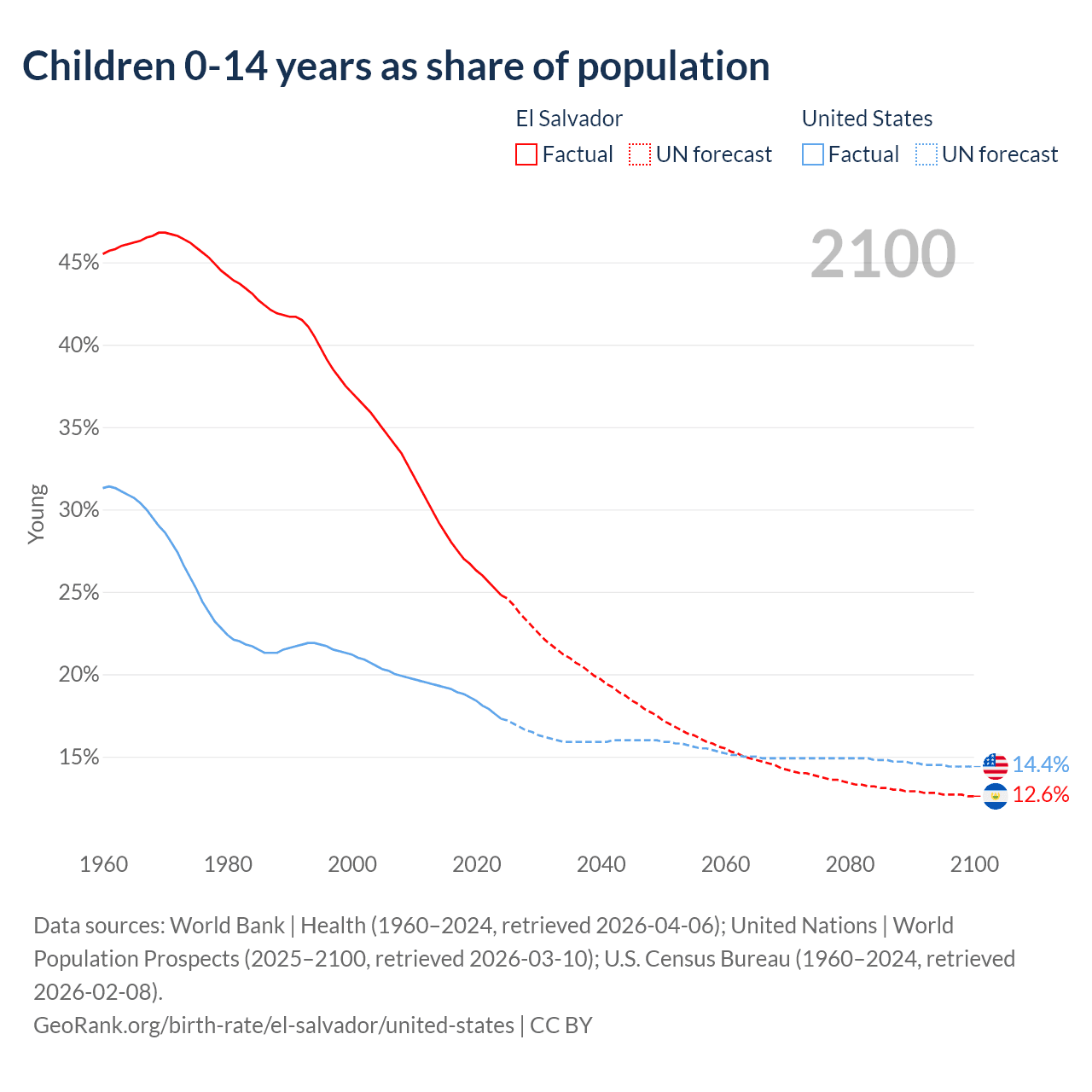 According to the latest available data on birth rates, the fertility rate in El Salvador was 1.78 children per woman in 2023, compared to 1.62 in the United States in 2023. The replacement level is considered to be 2.1 children per woman.