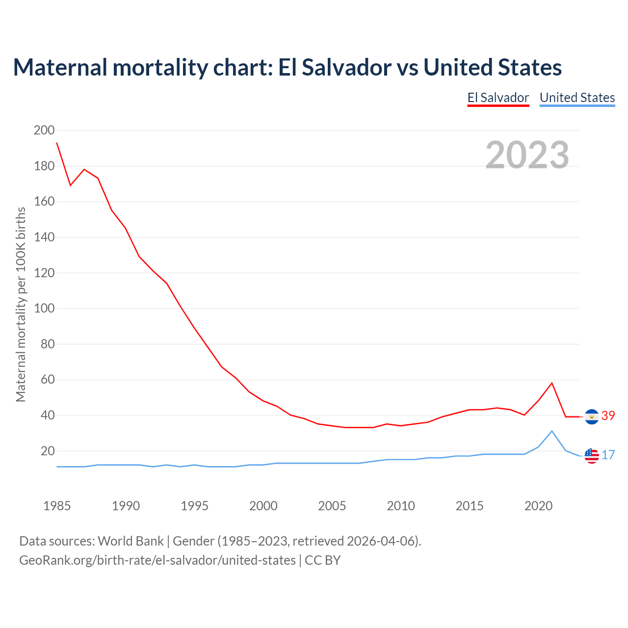 The maternal mortality rate, which is the probability of dying during childbirth or within 42 days of pregnancy termination, is 39 deaths per 100,000 live births in El Salvador, compared to 17 deaths in the United States.