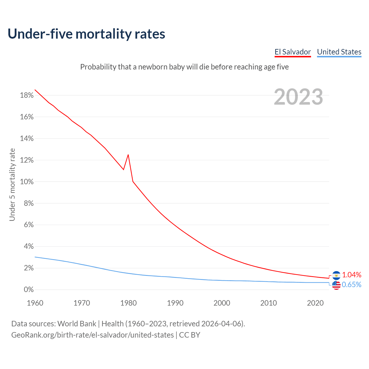 The chance that a newborn baby will die before reaching age five is 1.04% in El Salvador and 0.65% in the United States. Above is a chart with historical data on under-five mortality rates.