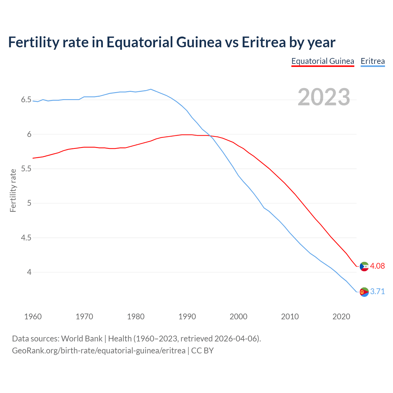 Fertility rate in Equatorial Guinea vs Eritrea by year