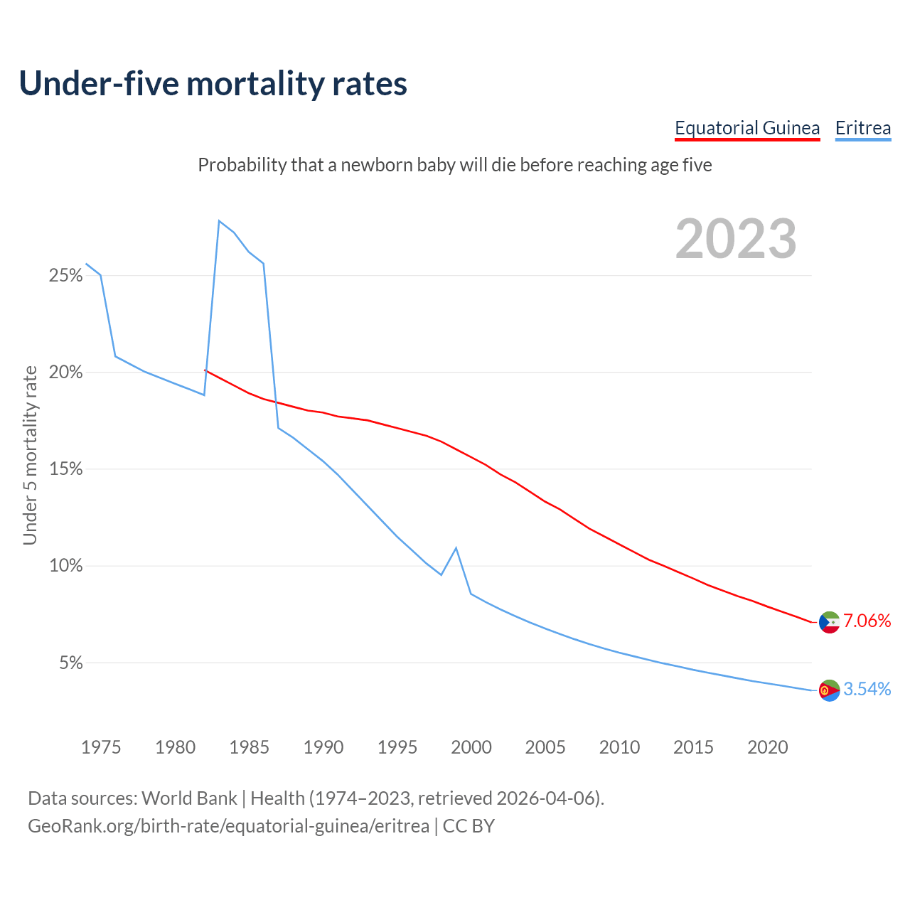 The chance that a newborn baby will die before reaching age five is 7.06% in Equatorial Guinea and 3.54% in Eritrea. Above is a chart with historical data on under-five mortality rates.