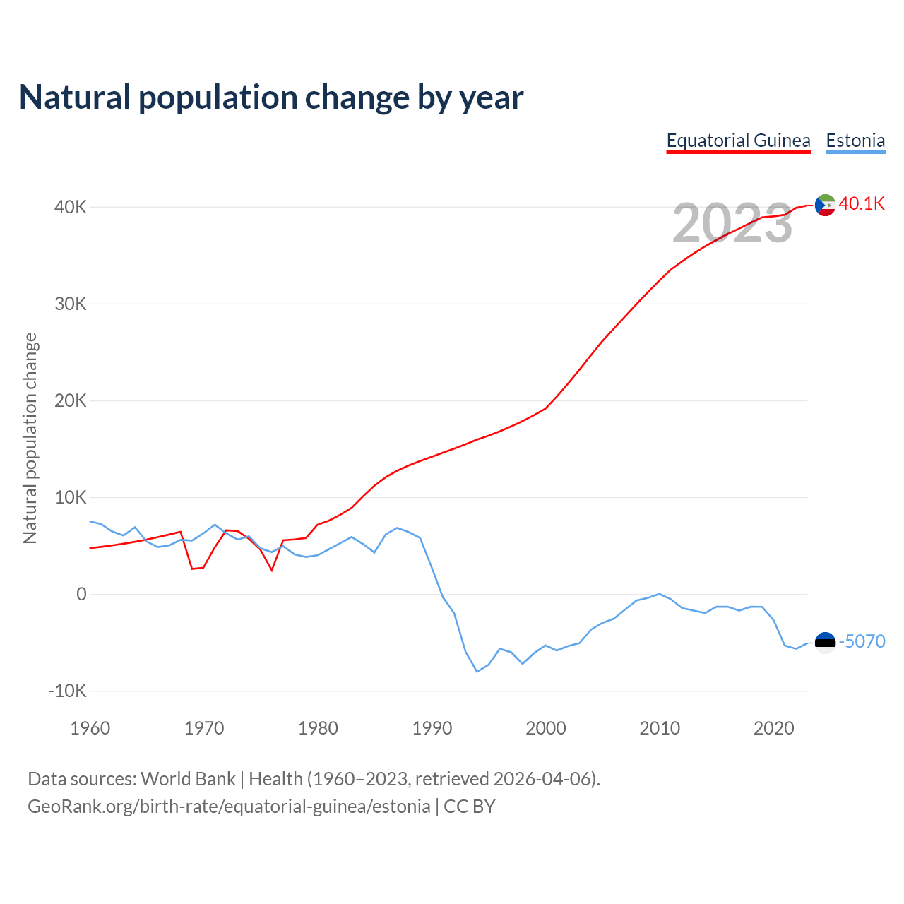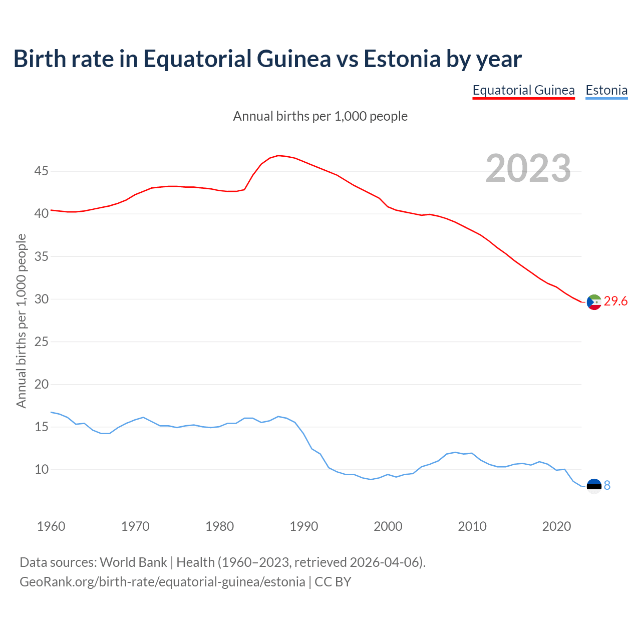 Equatorial Guinea has an annual birth rate of 29.6 births per 1,000 people, compared to 8 for Estonia. The average number of children a woman is expected to have during her lifetime — the fertility rate, is 4.08 in Equatorial Guinea and 1.31 in Estonia — 67.9% difference.