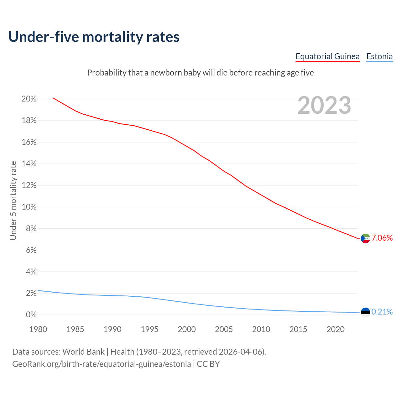 The chance that a newborn baby will die before reaching age five is 7.06% in Equatorial Guinea and 0.21% in Estonia. Above is a chart with historical data on under-five mortality rates.