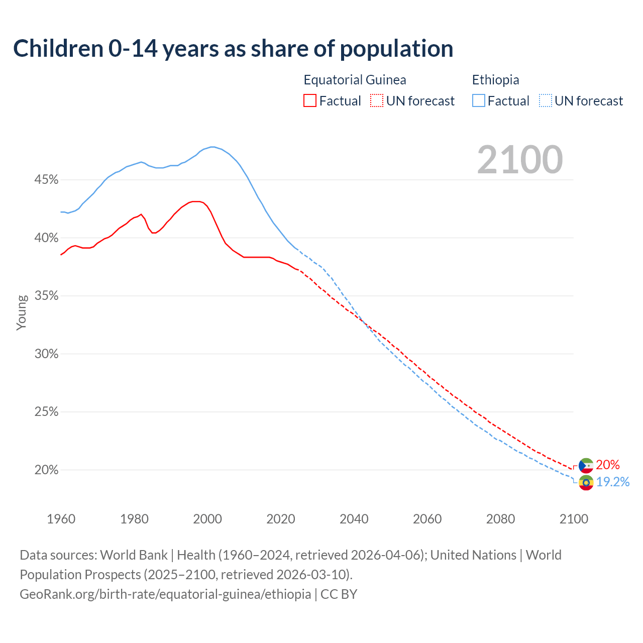 According to the latest available data on birth rates, the fertility rate in Equatorial Guinea was 4.08 children per woman in 2023, compared to 3.99 in Ethiopia in 2023. The replacement level is considered to be 2.1 children per woman.