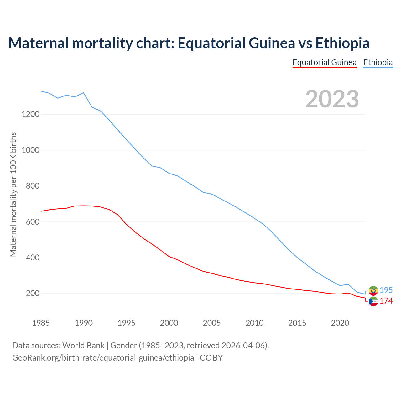 The maternal mortality rate, which is the probability of dying during childbirth or within 42 days of pregnancy termination, is 174 deaths per 100,000 live births in Equatorial Guinea, compared to 195 deaths in Ethiopia.