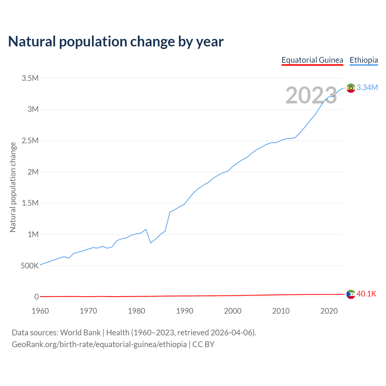 Equatorial Guinea has an annual birth rate of 29.6 births per 1,000 people, compared to 31.9 for Ethiopia. The average number of children a woman is expected to have during her lifetime — the fertility rate, is 4.08 in Equatorial Guinea and 3.99 in Ethiopia — 2.25% difference.