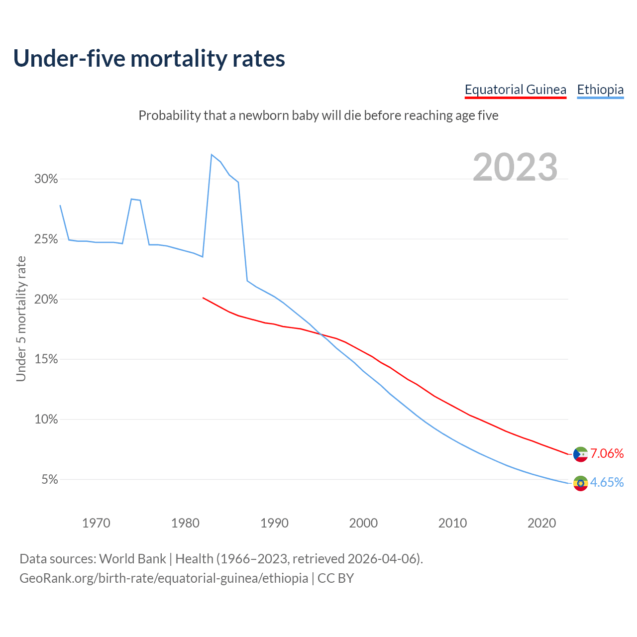 The chance that a newborn baby will die before reaching age five is 7.06% in Equatorial Guinea and 4.65% in Ethiopia. Above is a chart with historical data on under-five mortality rates.