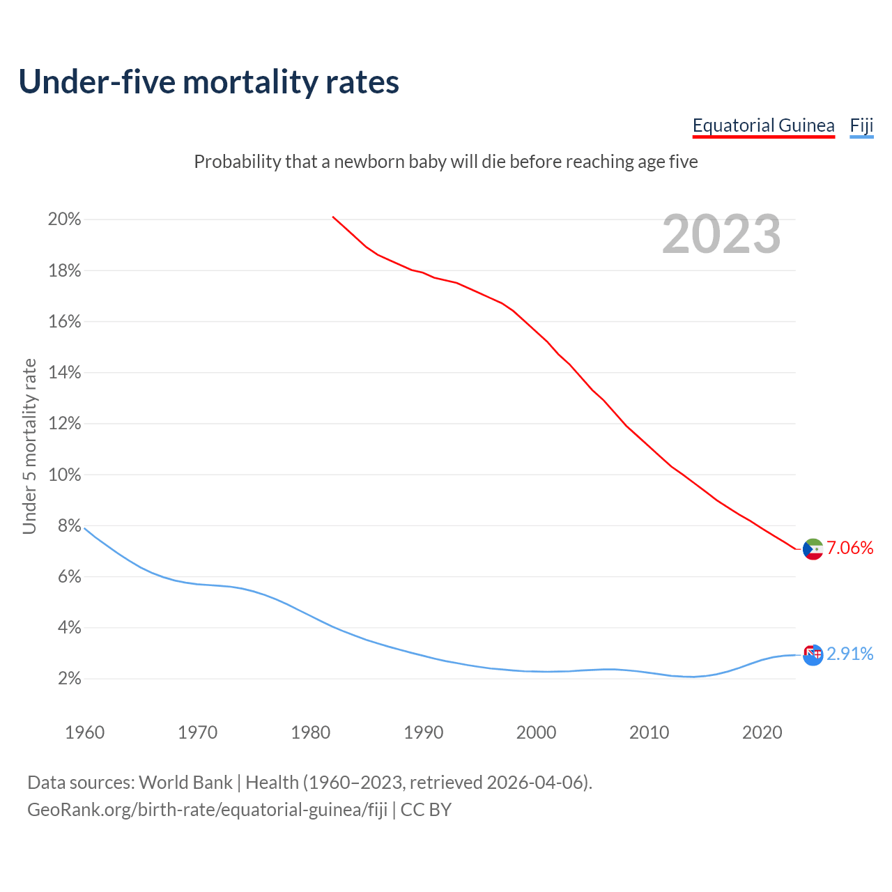 The chance that a newborn baby will die before reaching age five is 7.06% in Equatorial Guinea and 2.91% in Fiji. Above is a chart with historical data on under-five mortality rates.
