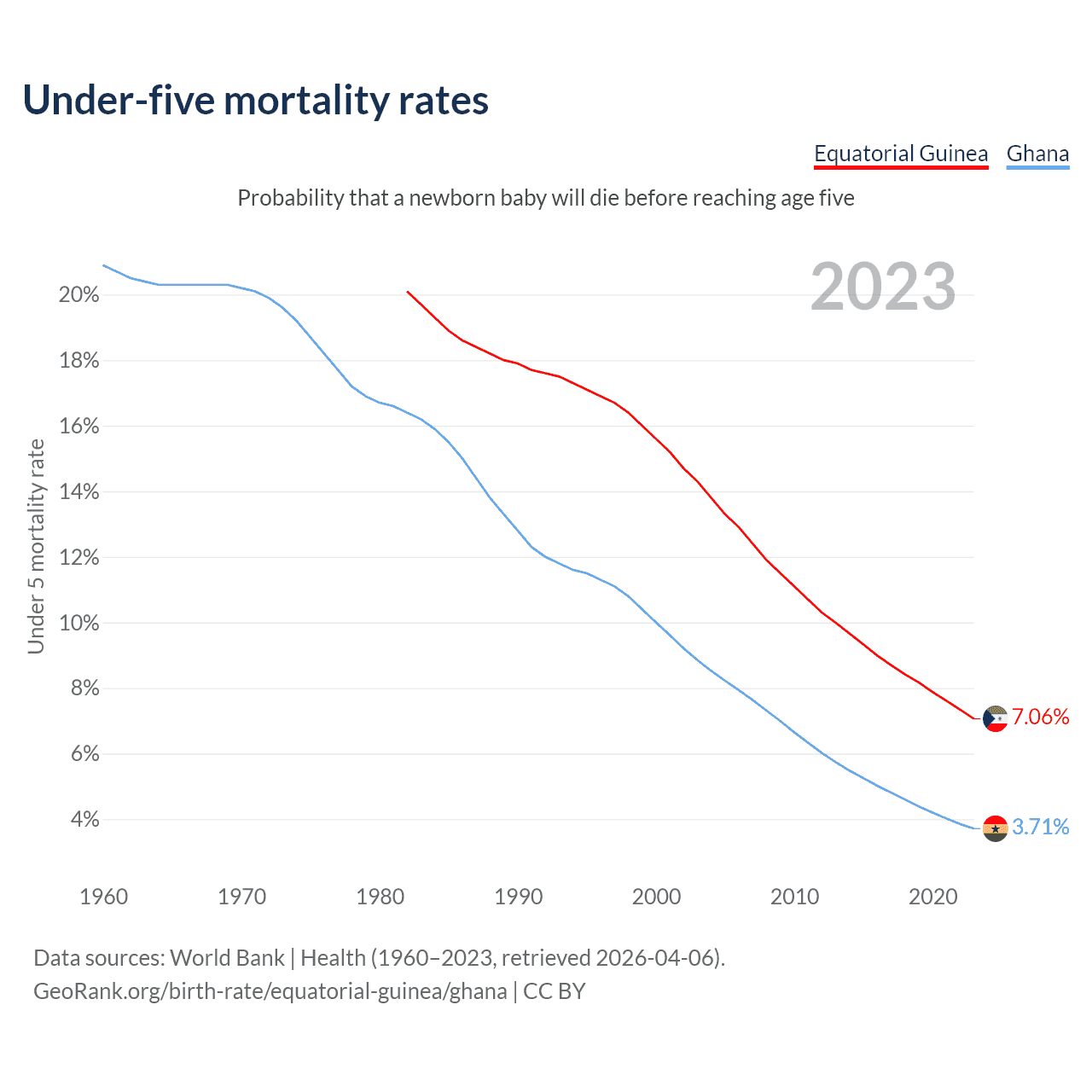The chance that a newborn baby will die before reaching age five is 7.06% in Equatorial Guinea and 3.71% in Ghana. Above is a chart with historical data on under-five mortality rates.