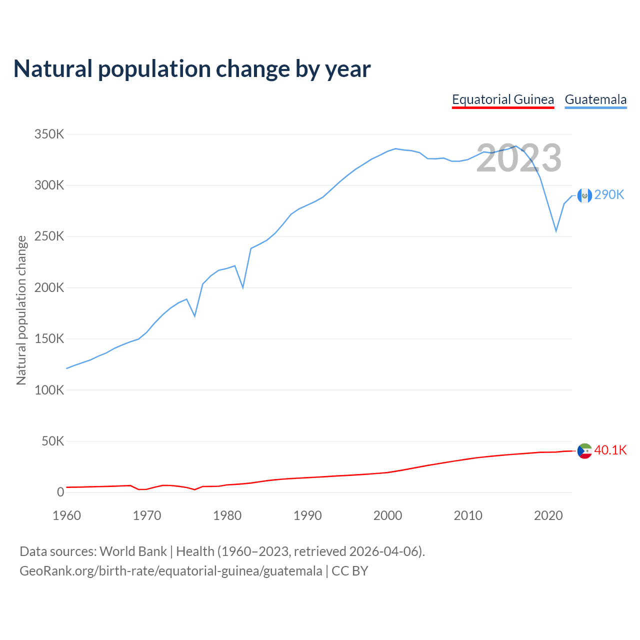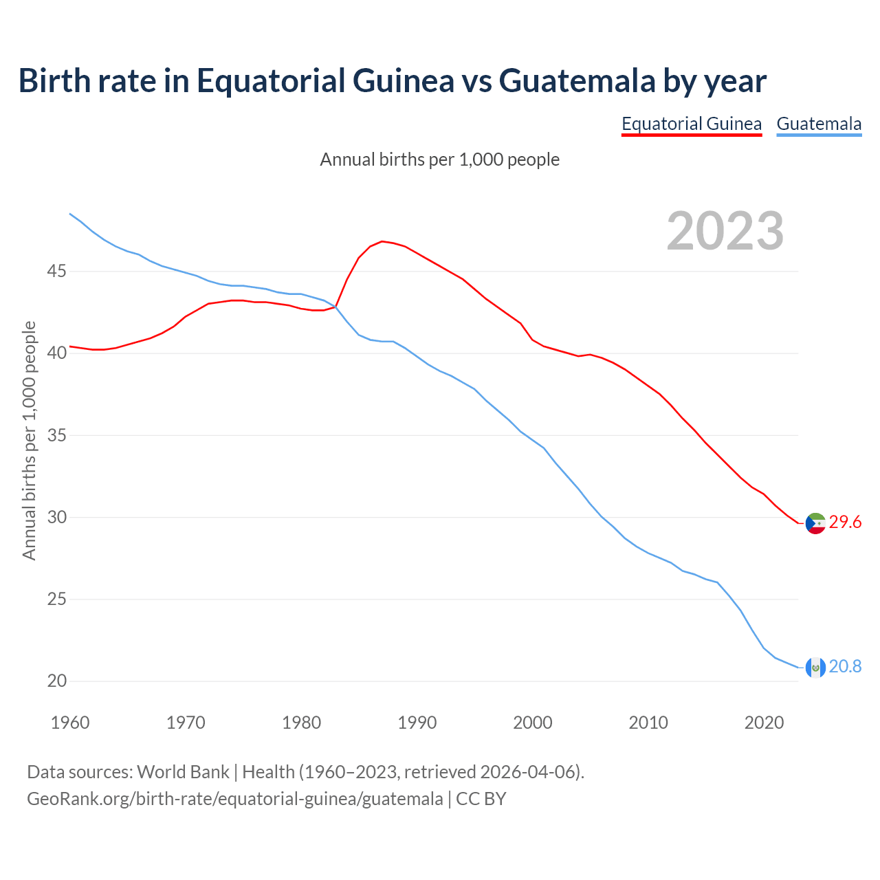 Equatorial Guinea has an annual birth rate of 29.6 births per 1,000 people, compared to 20.8 for Guatemala. The average number of children a woman is expected to have during her lifetime — the fertility rate, is 4.08 in Equatorial Guinea and 2.31 in Guatemala — 43.4% difference.