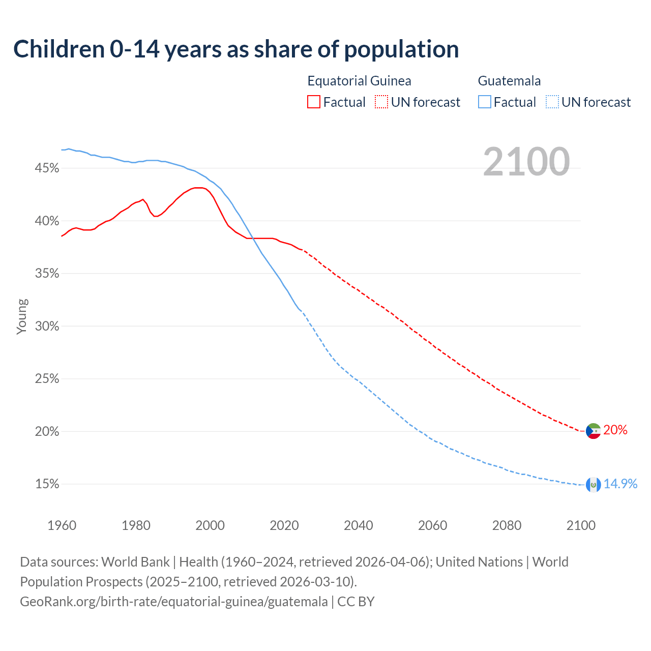 According to the latest available data on birth rates, the fertility rate in Equatorial Guinea was 4.08 children per woman in 2023, compared to 2.31 in Guatemala in 2023. The replacement level is considered to be 2.1 children per woman.