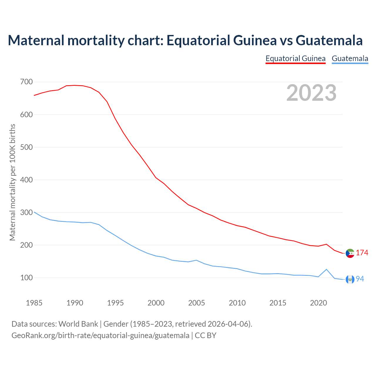 The maternal mortality rate, which is the probability of dying during childbirth or within 42 days of pregnancy termination, is 174 deaths per 100,000 live births in Equatorial Guinea, compared to 94 deaths in Guatemala.