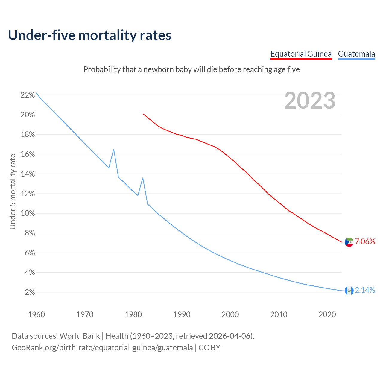 The chance that a newborn baby will die before reaching age five is 7.06% in Equatorial Guinea and 2.14% in Guatemala. Above is a chart with historical data on under-five mortality rates.