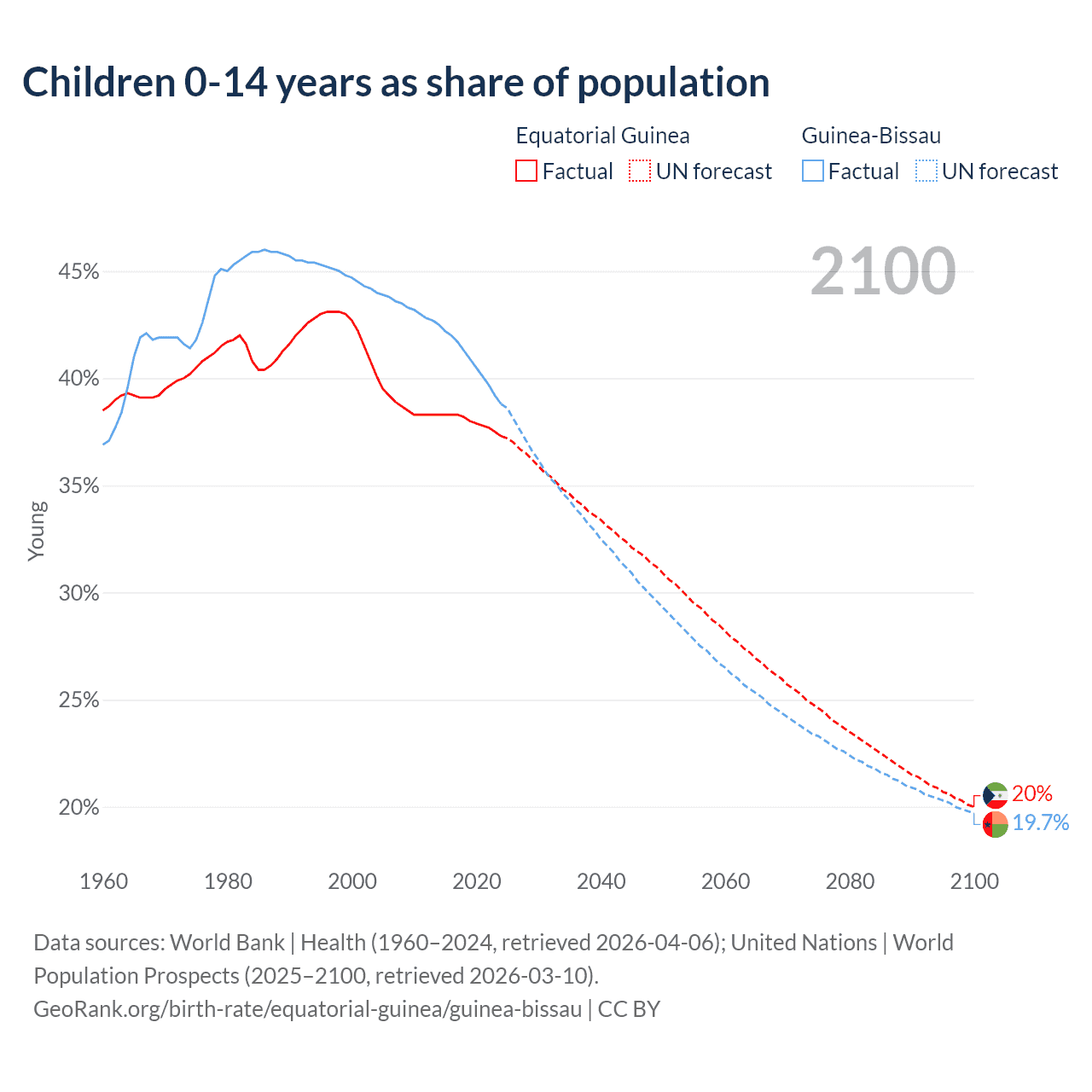 Children aged 0-14 make up 37.3% of the population in Equatorial Guinea and 38.8% in Guinea-Bissau in 2024, compared to 41.6% and 45.7% respectively in 1990.