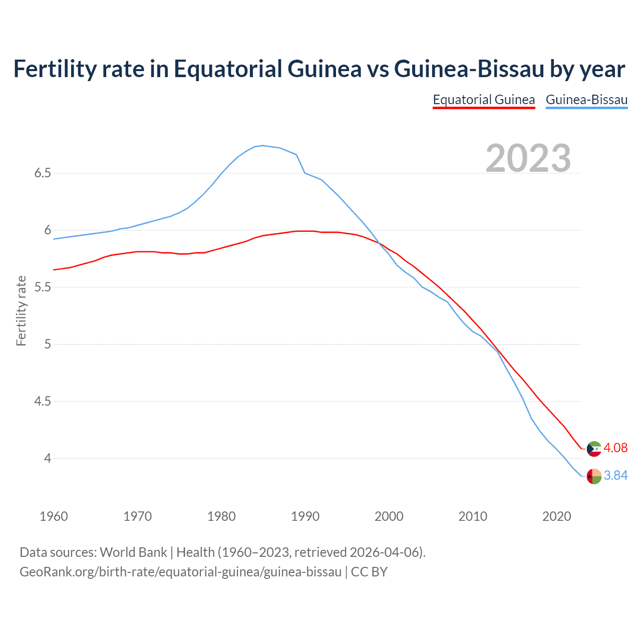 According to the latest available data on birth rates, the fertility rate in Equatorial Guinea was 4.08 children per woman in 2023, compared to 3.84 in Guinea-Bissau in 2023. The replacement level is considered to be 2.1 children per woman.