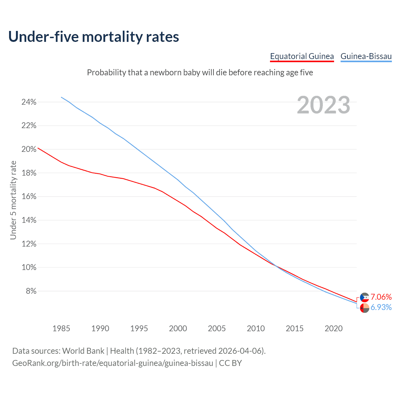 The chance that a newborn baby will die before reaching age five is 7.06% in Equatorial Guinea and 6.93% in Guinea-Bissau. Above is a chart with historical data on under-five mortality rates.