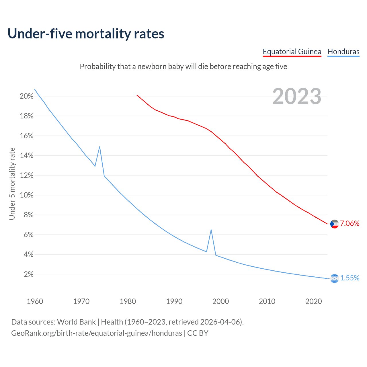 The chance that a newborn baby will die before reaching age five is 7.06% in Equatorial Guinea and 1.55% in Honduras. Above is a chart with historical data on under-five mortality rates.