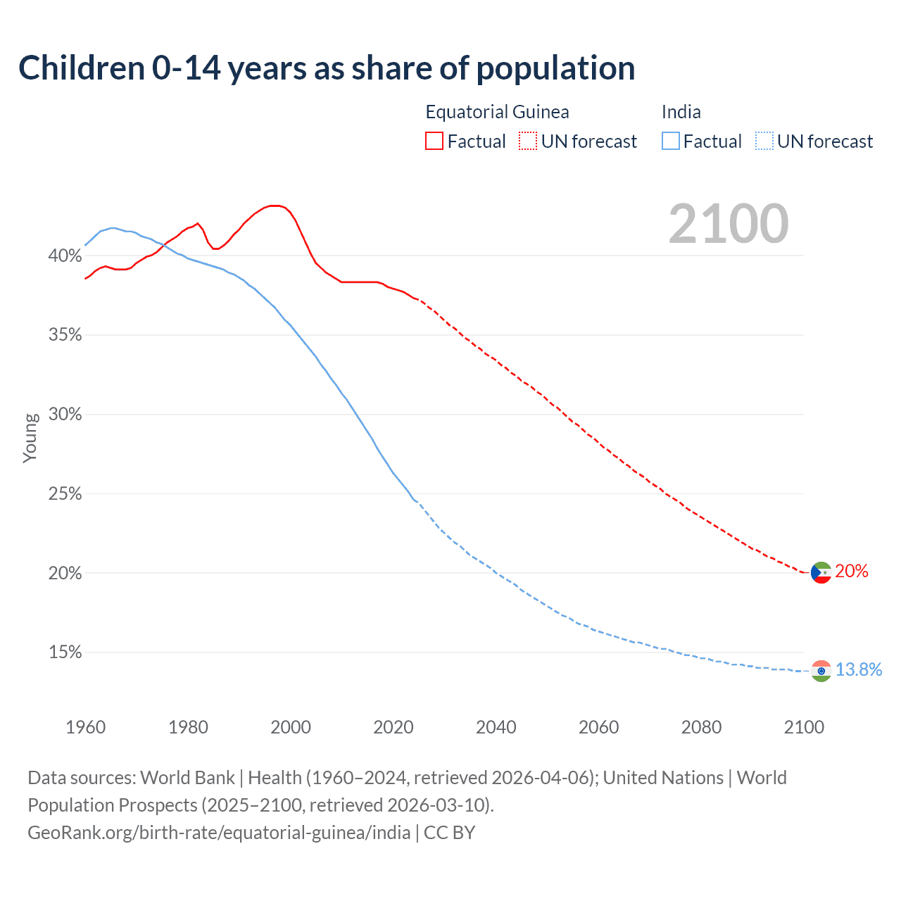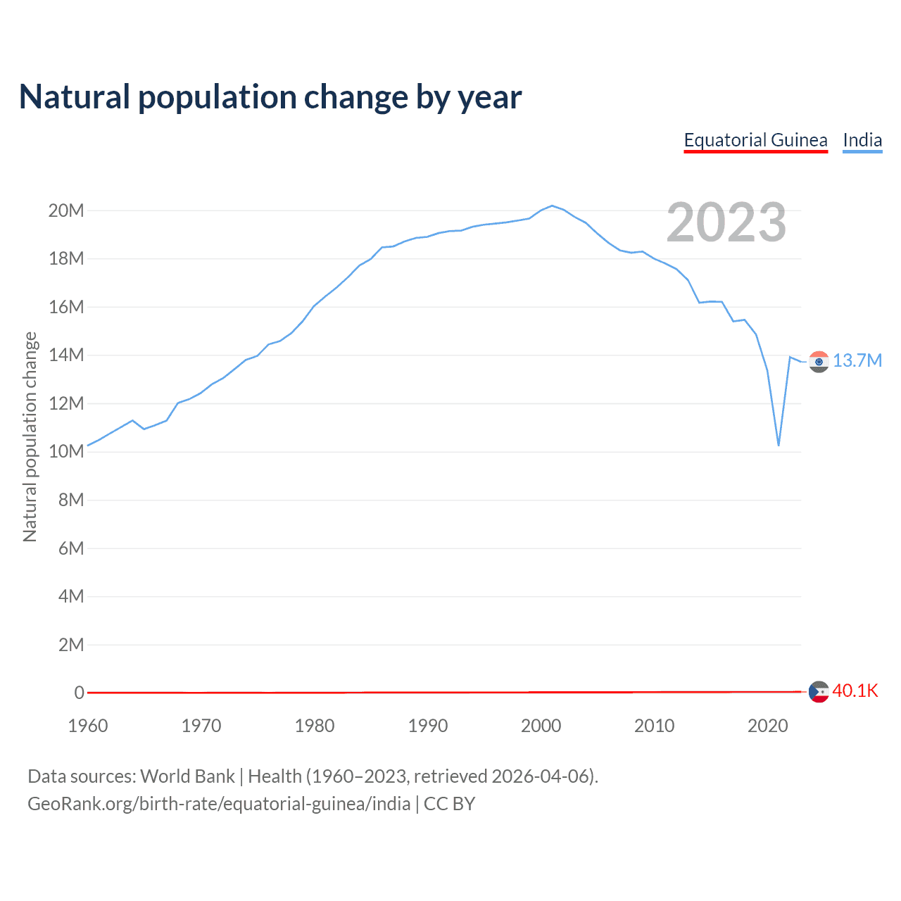 Equatorial Guinea has an annual birth rate of 29.6 births per 1,000 people, compared to 16.1 for India. The average number of children a woman is expected to have during her lifetime — the fertility rate, is 4.08 in Equatorial Guinea and 1.98 in India — 51.6% difference.