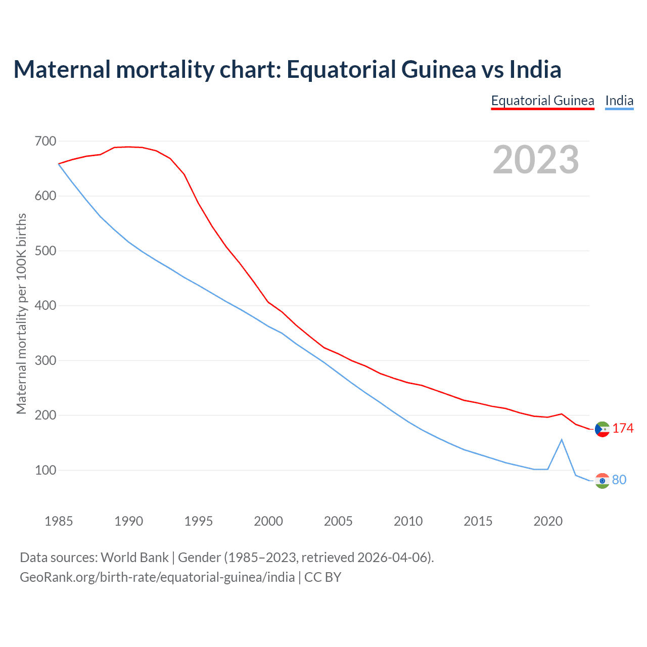 The maternal mortality rate, which is the probability of dying during childbirth or within 42 days of pregnancy termination, is 174 deaths per 100,000 live births in Equatorial Guinea, compared to 80 deaths in India.