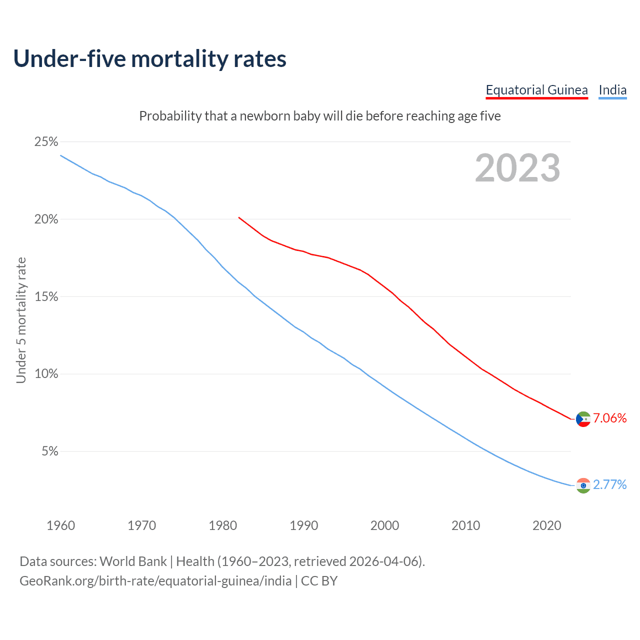 The chance that a newborn baby will die before reaching age five is 7.06% in Equatorial Guinea and 2.77% in India. Above is a chart with historical data on under-five mortality rates.