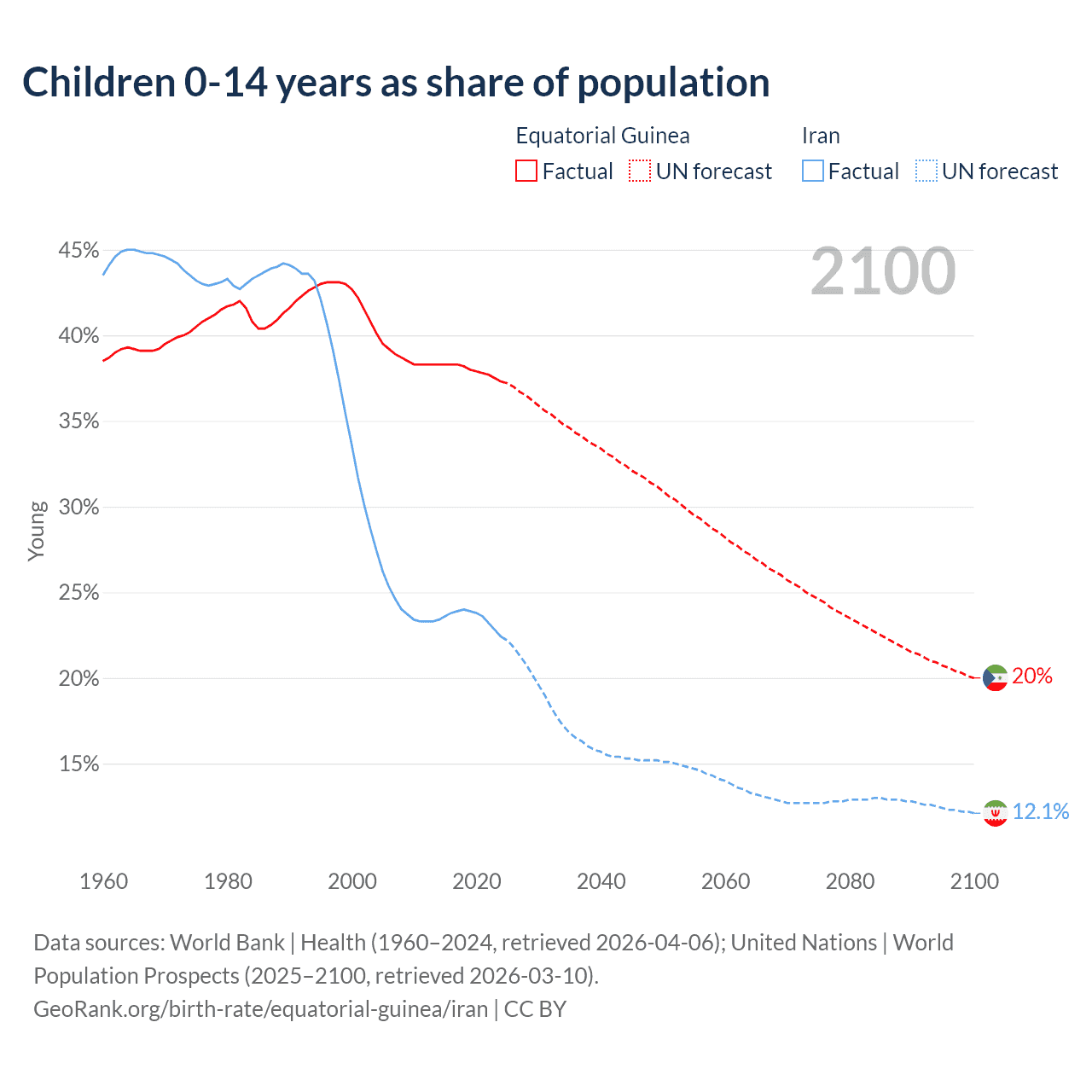 Equatorial Guinea has an annual birth rate of 29.6 births per 1,000 people, compared to 13 for Iran. The average number of children a woman is expected to have during her lifetime — the fertility rate, is 4.08 in Equatorial Guinea and 1.7 in Iran — 58.5% difference.