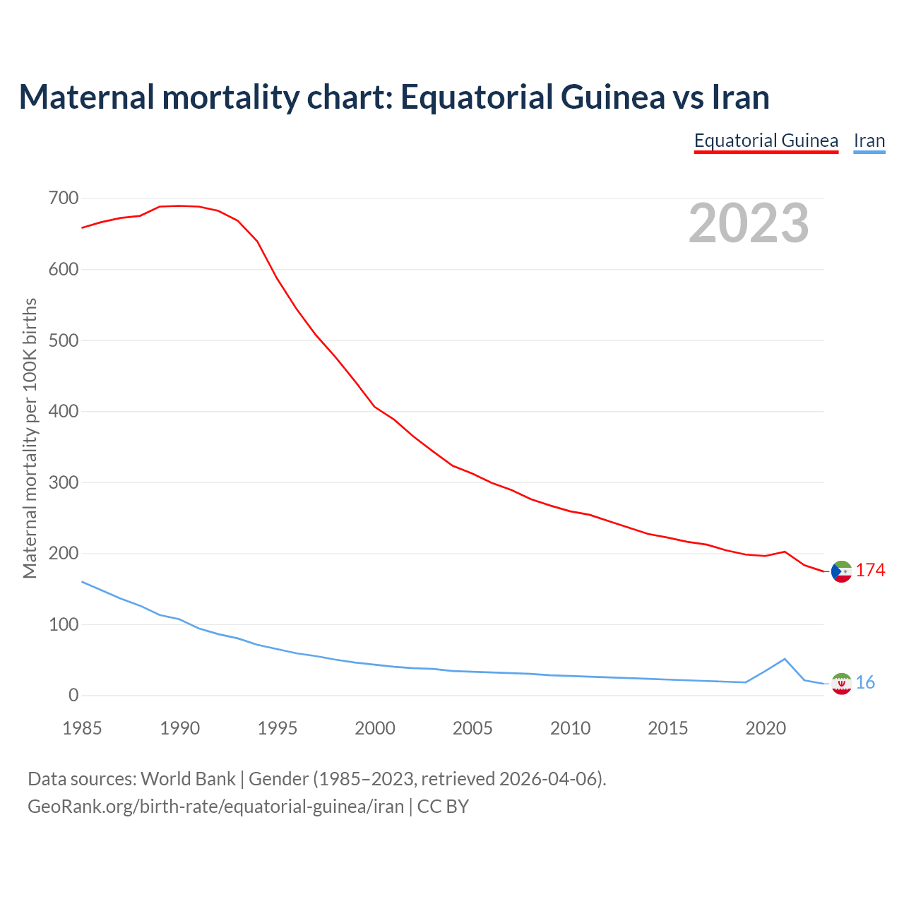 The maternal mortality rate, which is the probability of dying during childbirth or within 42 days of pregnancy termination, is 174 deaths per 100,000 live births in Equatorial Guinea, compared to 16 deaths in Iran.