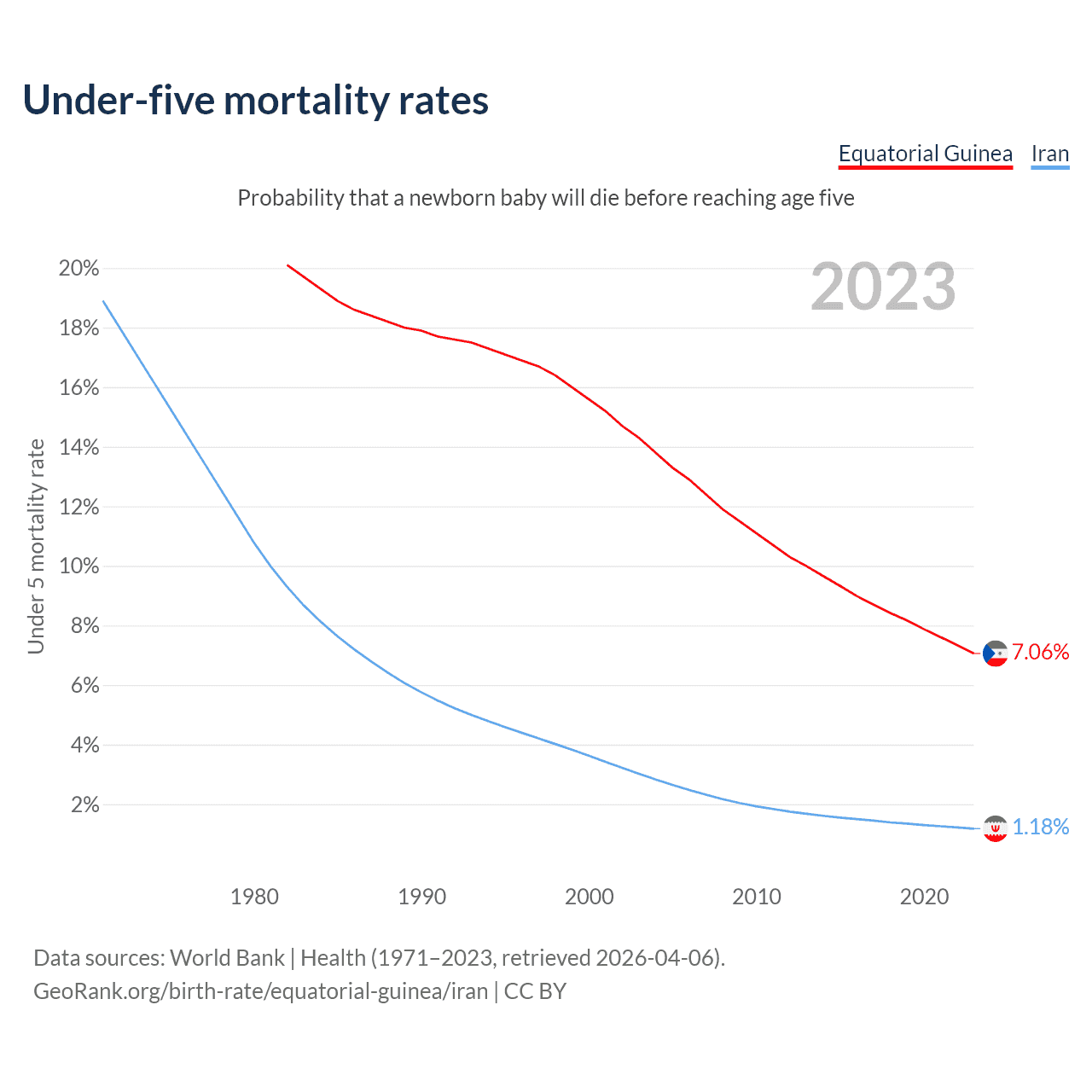 The chance that a newborn baby will die before reaching age five is 7.06% in Equatorial Guinea and 1.18% in Iran. Above is a chart with historical data on under-five mortality rates.