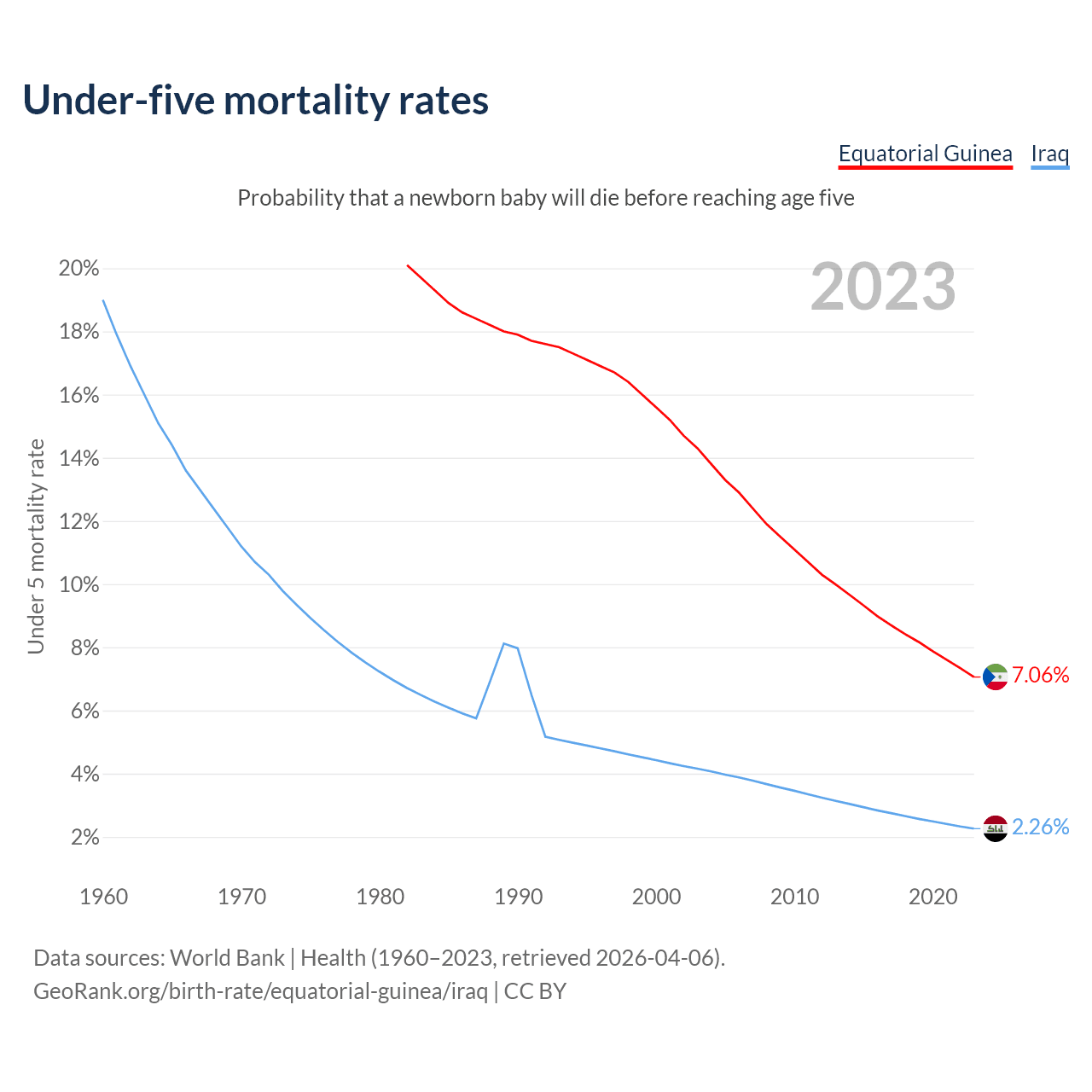 The chance that a newborn baby will die before reaching age five is 7.06% in Equatorial Guinea and 2.26% in Iraq. Above is a chart with historical data on under-five mortality rates.