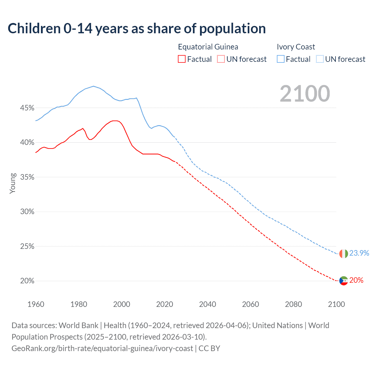 According to the latest available data on birth rates, the fertility rate in Equatorial Guinea was 4.08 children per woman in 2023, compared to 4.28 in Ivory Coast in 2023. The replacement level is considered to be 2.1 children per woman.