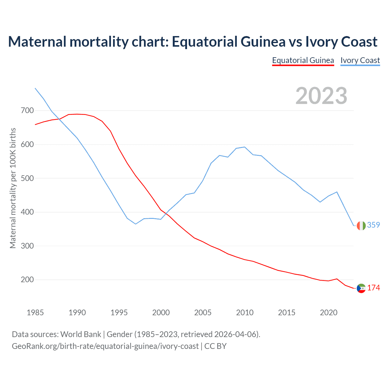 The maternal mortality rate, which is the probability of dying during childbirth or within 42 days of pregnancy termination, is 174 deaths per 100,000 live births in Equatorial Guinea, compared to 359 deaths in Ivory Coast.
