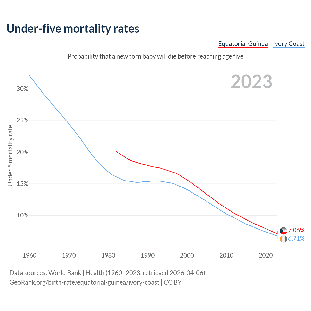 The chance that a newborn baby will die before reaching age five is 7.06% in Equatorial Guinea and 6.71% in Ivory Coast. Above is a chart with historical data on under-five mortality rates.