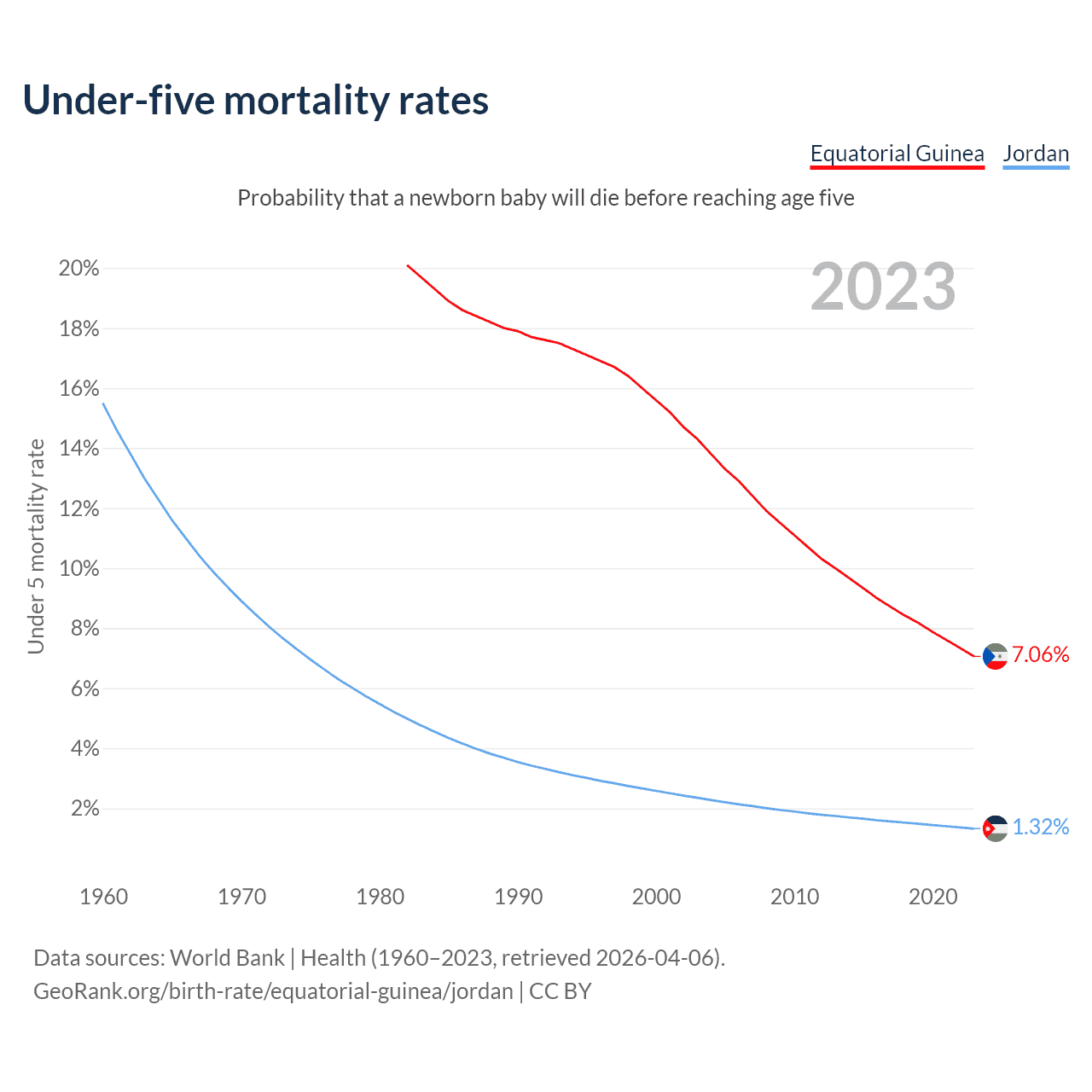 The chance that a newborn baby will die before reaching age five is 7.06% in Equatorial Guinea and 1.32% in Jordan. Above is a chart with historical data on under-five mortality rates.