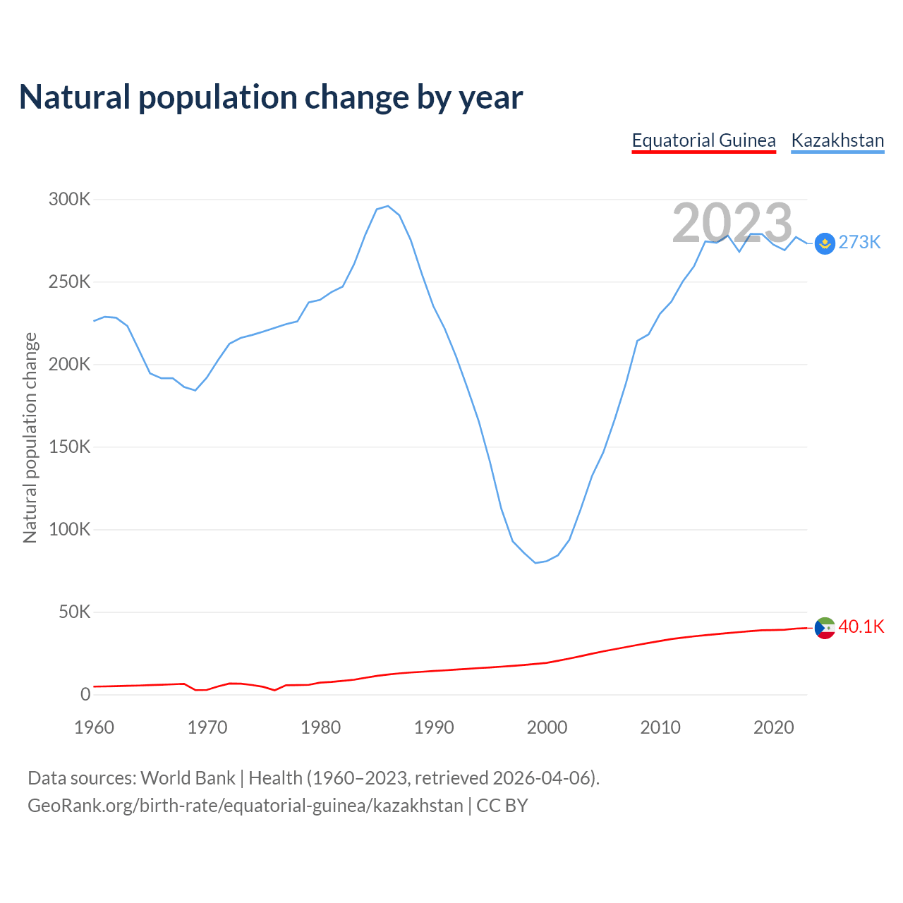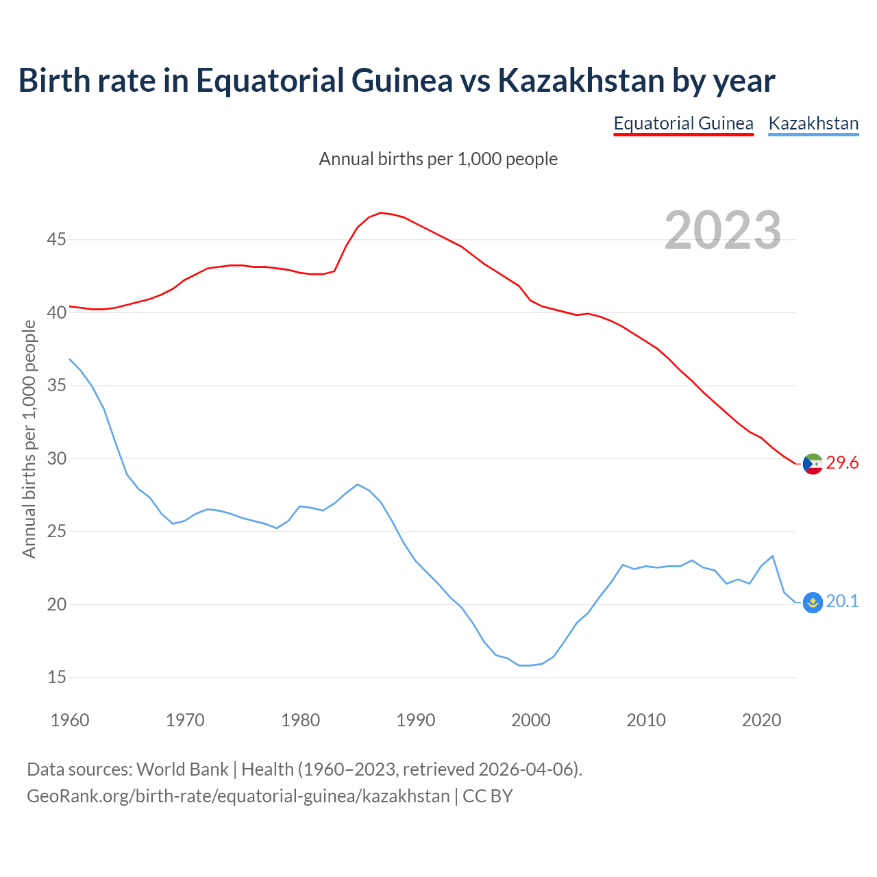 Equatorial Guinea has an annual birth rate of 29.6 births per 1,000 people, compared to 20.1 for Kazakhstan. The average number of children a woman is expected to have during her lifetime — the fertility rate, is 4.08 in Equatorial Guinea and 3.01 in Kazakhstan — 26.2% difference.