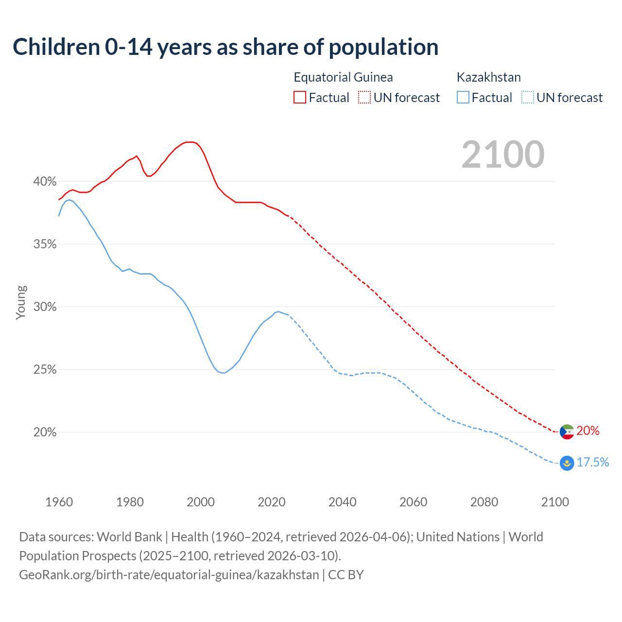 According to the latest available data on birth rates, the fertility rate in Equatorial Guinea was 4.08 children per woman in 2023, compared to 3.01 in Kazakhstan in 2023. The replacement level is considered to be 2.1 children per woman.