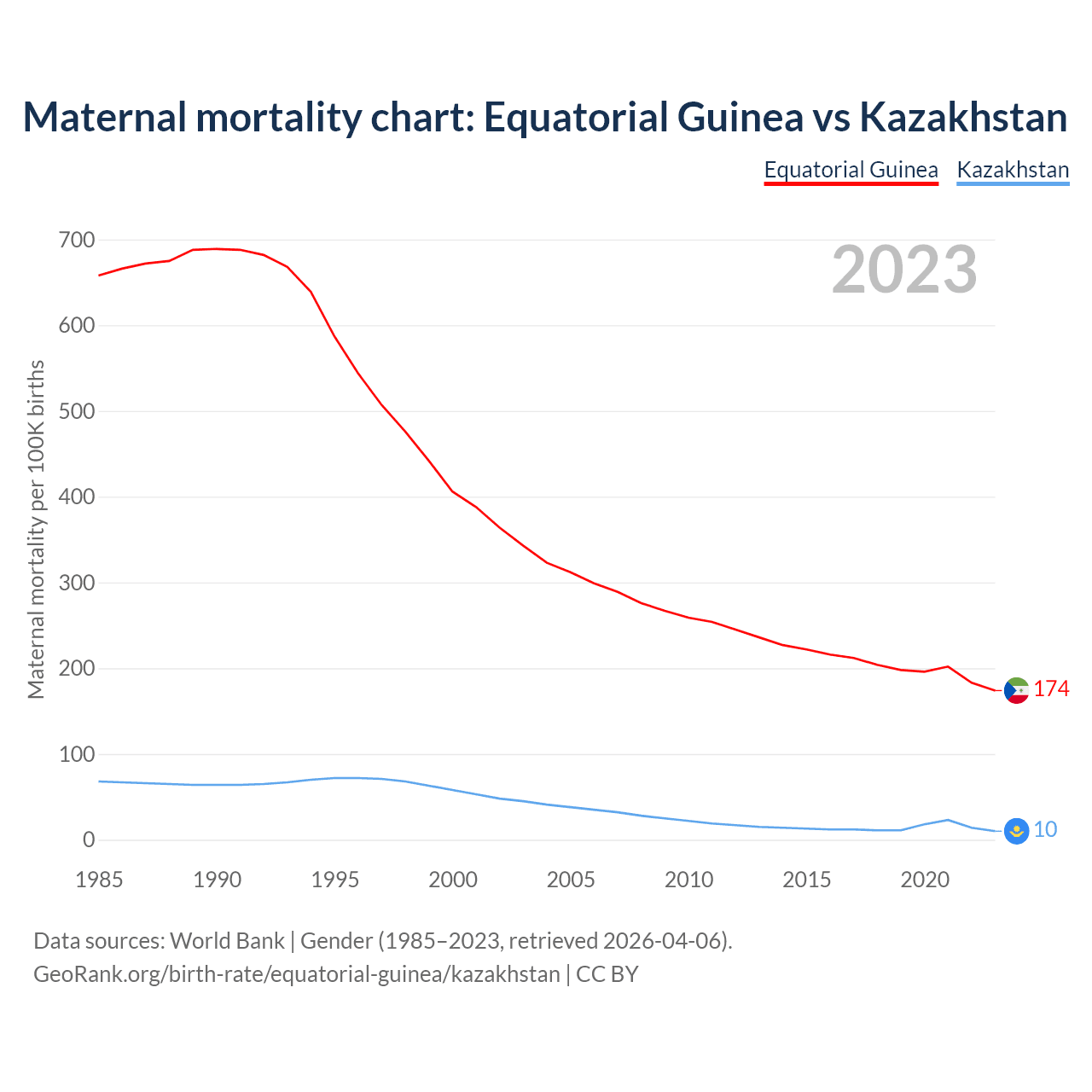 The maternal mortality rate, which is the probability of dying during childbirth or within 42 days of pregnancy termination, is 174 deaths per 100,000 live births in Equatorial Guinea, compared to 10 deaths in Kazakhstan.