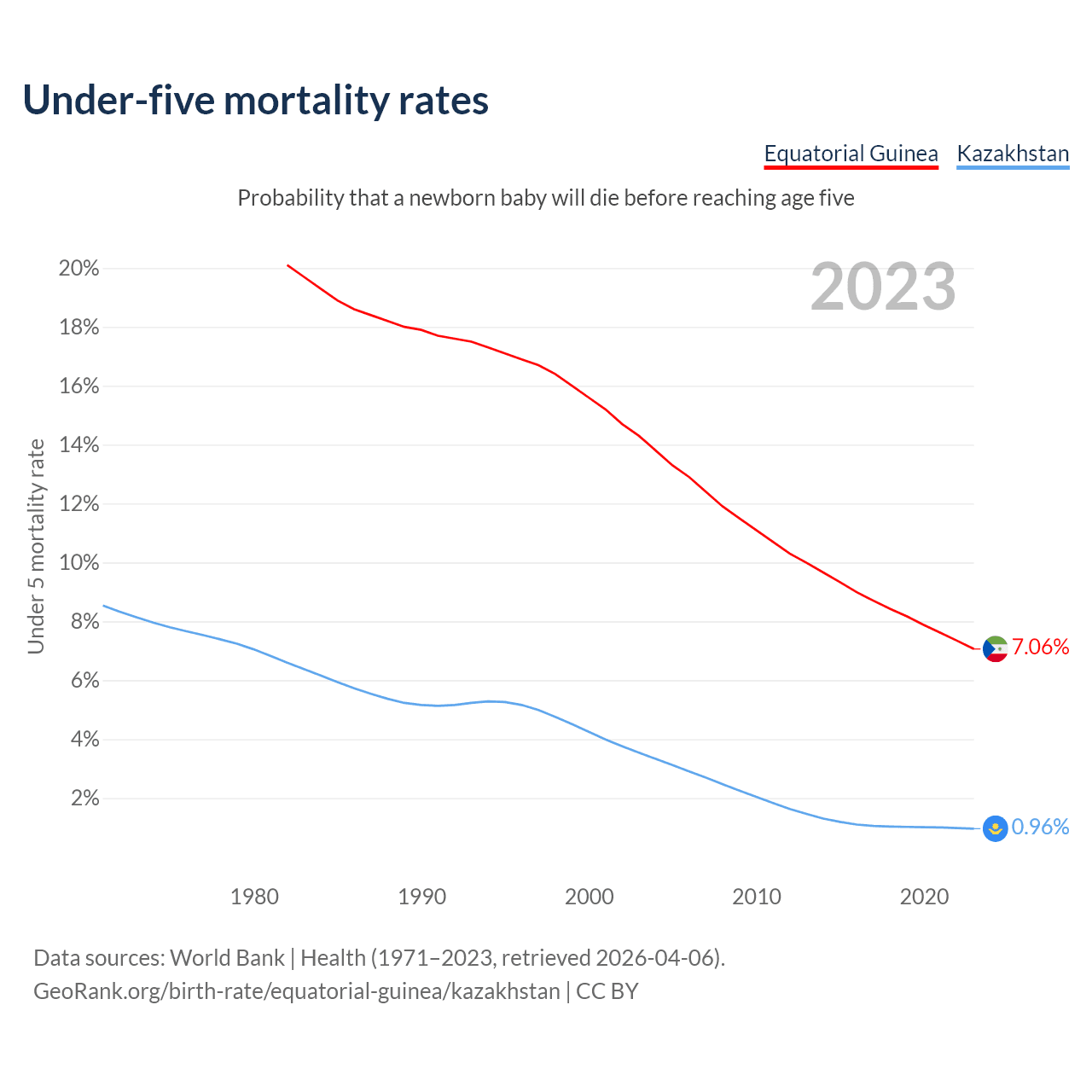 The chance that a newborn baby will die before reaching age five is 7.06% in Equatorial Guinea and 0.96% in Kazakhstan. Above is a chart with historical data on under-five mortality rates.