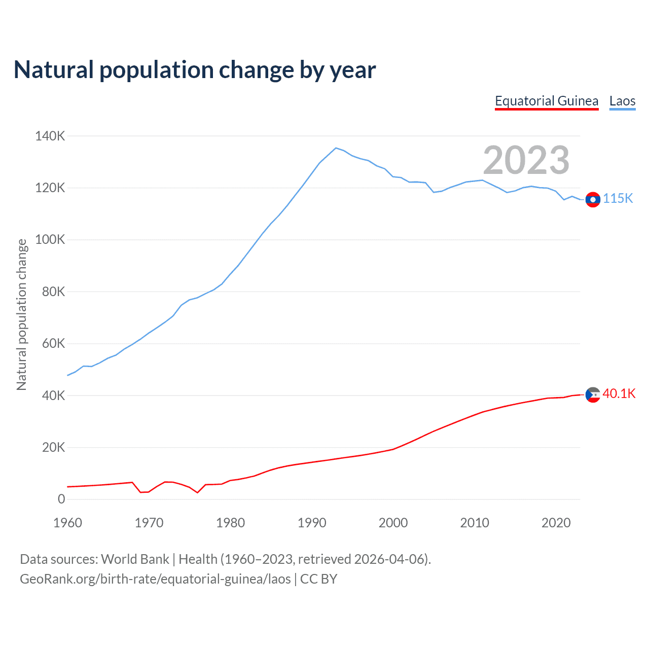 Equatorial Guinea has an annual birth rate of 29.6 births per 1,000 people, compared to 21.3 for Laos. The average number of children a woman is expected to have during her lifetime — the fertility rate, is 4.08 in Equatorial Guinea and 2.42 in Laos — 40.7% difference.