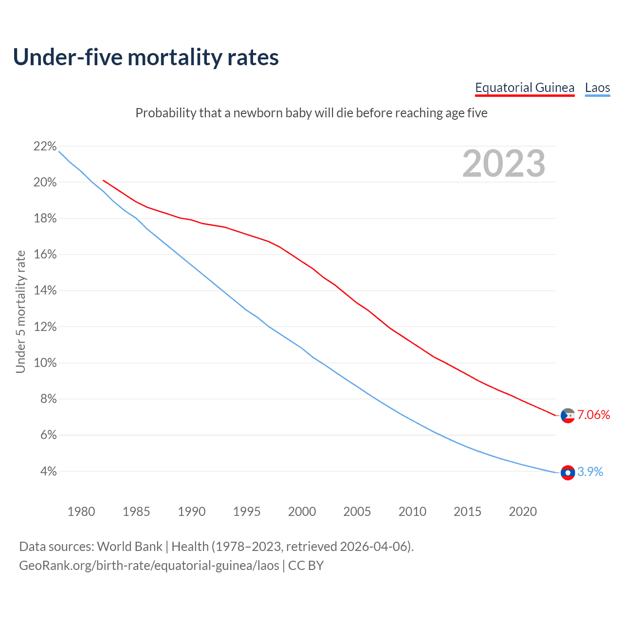 The chance that a newborn baby will die before reaching age five is 7.06% in Equatorial Guinea and 3.9% in Laos. Above is a chart with historical data on under-five mortality rates.