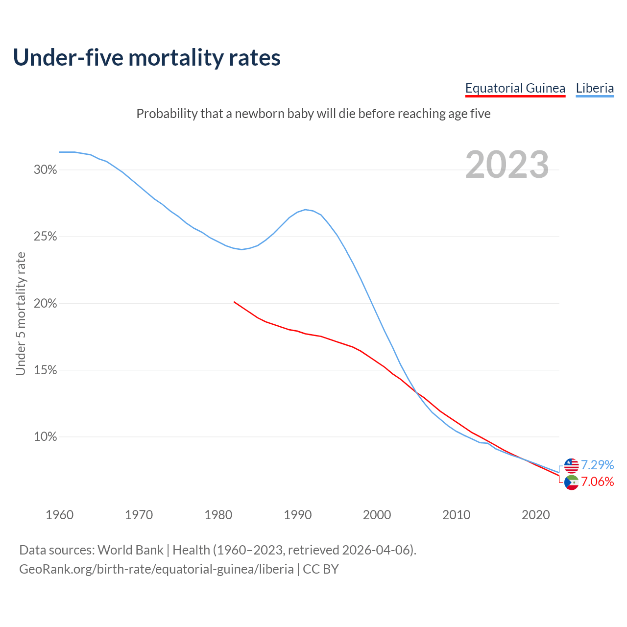 The chance that a newborn baby will die before reaching age five is 7.06% in Equatorial Guinea and 7.29% in Liberia. Above is a chart with historical data on under-five mortality rates.